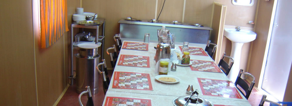 Dining rooms to comfortably seat 10 to 20 people are available. They ensure pleasant, hygienic atmosphere along with bonhomie to make dining a pleasant experience. Cabins are supplied with fridge, water-purifier, water-cooler, bain-marie, serving tables and wash-basins apart from thoughtfully decorated interiors and comfortable seating arrangements.