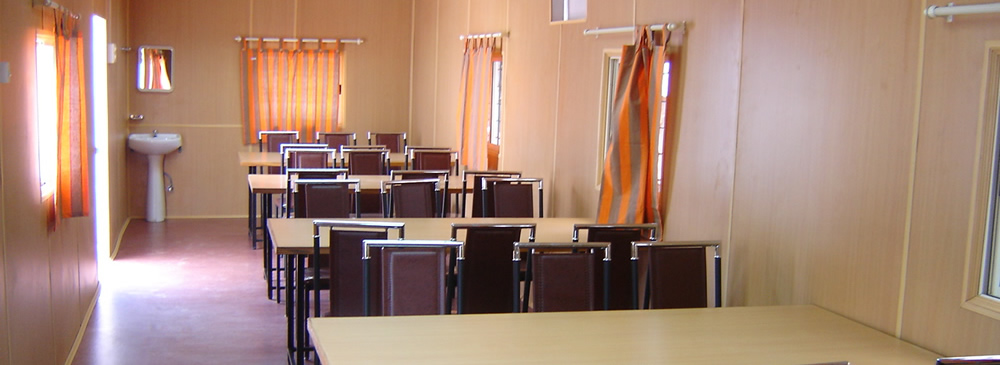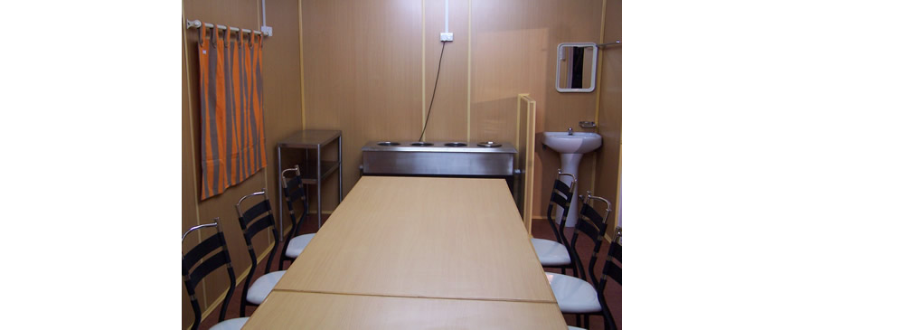 Canteens and Mess to comfortably seat 10 to 50 people are available. They ensure pleasant, hygienic atmosphere along with bonhomie to make dining a pleasant experience. Cabins are supplied with fridge, water-purifier, water-cooler, bain-marie, serving tables and wash-basins apart from thoughtfully decorated interiors and comfortable seating arrangements.